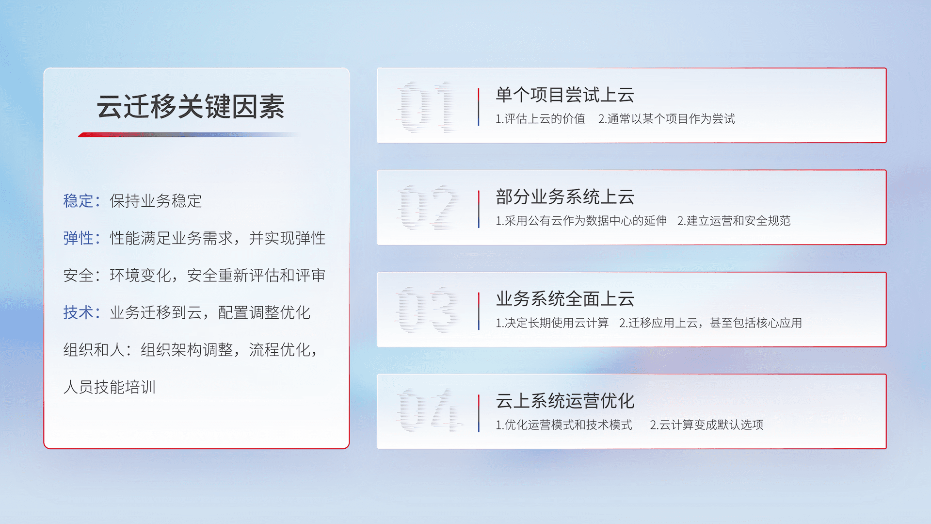 结合实际业务,,,,从规划设计、、、云平台选型、、云原生改造、、、、数据迁移、、、、集成交付,,迁移全过程为客户识别最佳上云路径,,做好风险识别管理,,设计网络架构、、、身份权限、、安全审计合规、、、、操作审计、、、、日志审计、、监控告警策略、、、多站点容灾设计等,,,对云上基础设施进行整体规划,,,,提升IT治理水平,,,以满足弹性、、高可用、、高性能的需求。。