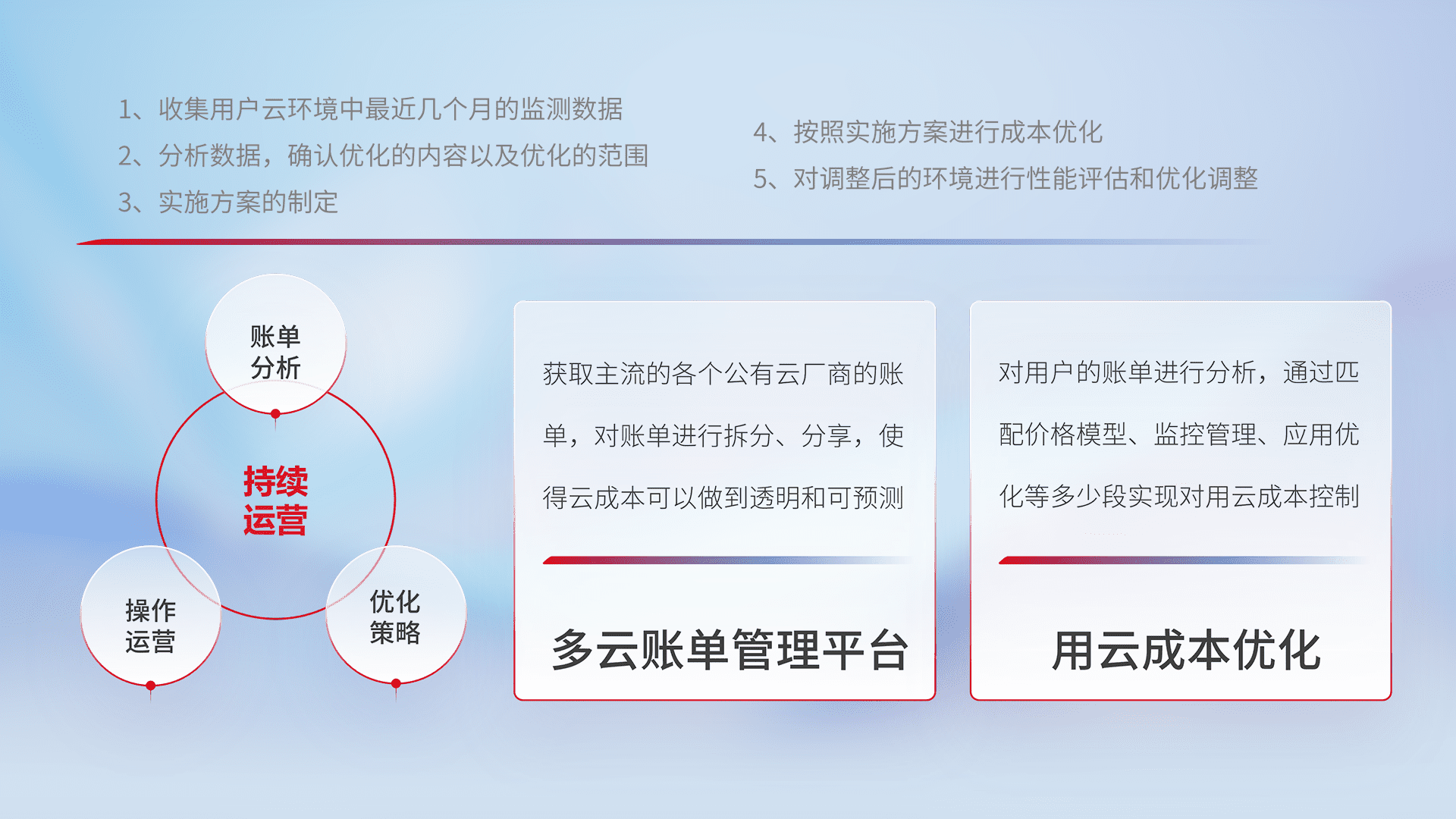 通过多云纳管,,以统一的资源数据模型把客户的云资源进行抽象和封装,,,,进而实现对多云资源的统一操作,,,保障云资源管理的可靠性、、稳定性与可用性。。。量身定制化运维内容,,配置、、开发运维、、、补丁管理、、、、备份、、监控、、、、认证和访问管理、、审计和日常巡检等,,保障在用云过程中的可靠度,,,稳定度以及高可用率。。。